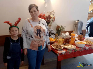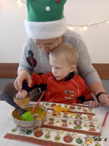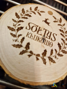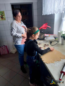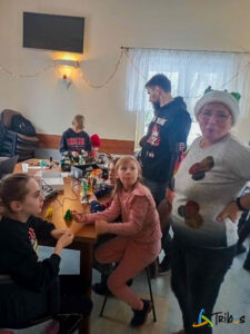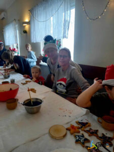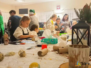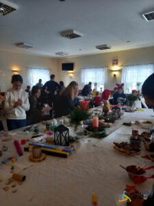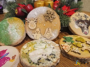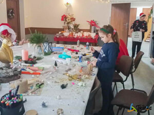 Głównym punktem warsztatów był artystyczny stół, pełen farb, brokatu i surowego drewna w różnorodnych formach. Dzieci i młodzież łączyły te elementy w dowolny sposób, tworząc efektowne dekoracje ekologiczne i świąteczne. Po drugiej stronie stołu trwały pokazy plastyczno kulinarne – dekorowanie pierników świątecznych, które upiekła sołtys Klukowa