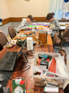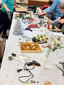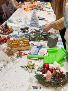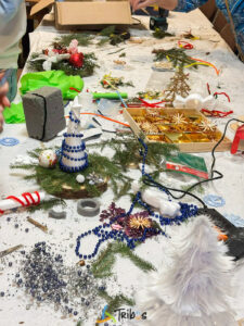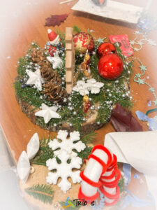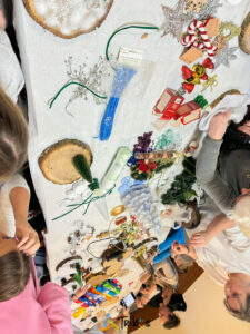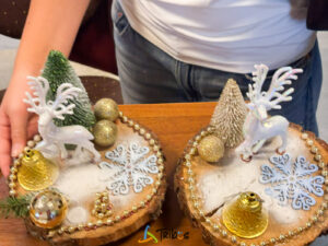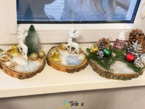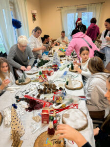 Powstawały dekoracje z wykorzystaniem naturalnych elementów i klasycznych świątecznych dodatków: krążków drewna, gałązek iglastych, szyszek oraz bombek i łańcuchów, a część prac układała się w małe stroiki i kompozycje. Widać było, że każdy projekt jest inny – jedni wybierali minimalizm (np. pojedyncze figurki i delikatne akcenty), inni tworzyli bogatsze, kolorowe zestawienia