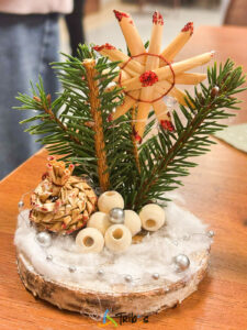 Tym razem zamiast sklepowych dekoracji postawiliśmy na rękodzieło zakorzenione w tradycji. Uczestnicy poznali historię oraz symbolikę krajeńskich „pająków” ludowych – lekkich, misternych konstrukcji ze słomy i bibuły, które dawniej były sercem świątecznego wystroju w domach na Krajnie. Opowieści o tym, jak powstawały i co oznaczały, naturalnie prowadziły do wspomnień, rodzinnych historii i dzielenia się tym, „jak to u nas bywało”.