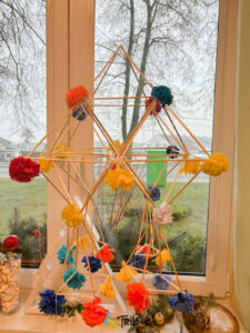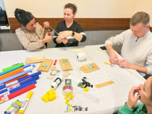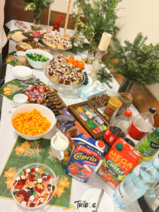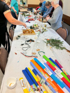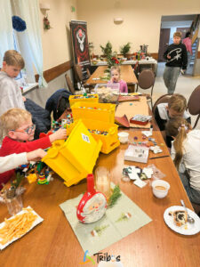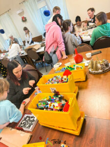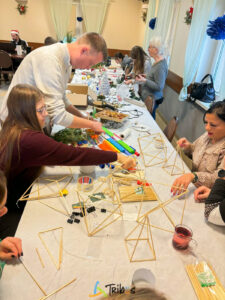 Cieszyło nas, że spotkanie miało charakter międzypokoleniowy: dzieci działały obok dorosłych, a w tle toczyły się rozmowy i wymiana pomysłów. Nie trzeba było żadnego doświadczenia – wystarczyła ciekawość i gotowość, by spróbować, dotknąć tradycyjnych materiałów i stworzyć ozdobę, która nie tylko udekoruje dom, ale też opowie kawałek historii naszego regionu. Była też przestrzeń na chwilę odpoczynku i „coś na ząb” 🙂